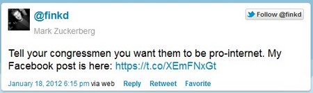 Bên cạnh đó, Zuckerberg còn bày tỏ sự phản đối của mình với dự luật SOPA/PIPA bằng cách gửi đi đoạn thông điệp trên mạng xã hội Twitter. Đây là đoạn thông điệp đầu tiên mà Zuckerberg đăng tải trở lại trên Twitter kể từ lần đăng tải cuối cùng vào năm 2009.